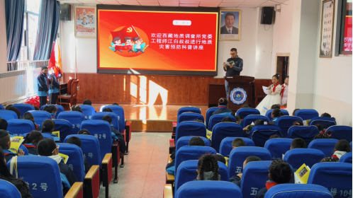 活动中,党员干部们首先来到白定小学,共同开展了科普志愿服务活动。军民融合中心西藏地质调查所科普工作人员江白、工程师洛松分别为白定小学的学生们带来了“认识黄金”和“认识地质灾害,学会保护自我”为主题的精彩科普讲座。江白老师作为一名前黄金部队教官,用学生喜闻乐见和通俗易懂的方式,讲解了黄金的属性、特点、用途、开采历程以及黄金相关联的诗词歌赋等,通过小故事、小实验让孩子们了解黄金认识黄金。